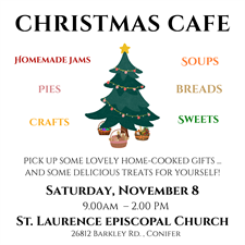 Feeling a bit hungry after shopping the Conifer Holiday Boutique? Looking for some cozy, classic holiday treats? Come to the annual Christmas Cafe at St. Laurence Episcopal Church! We've got some delicious homemade treats for all your gifting needs. Come grab some treats for your friends and lunch for yourself: we'll have ready-to-eat breakfast burritos, pies, several kinds of soups (with rolls and butter to match, of course), sweet treats, and more! We'll also have some great (and unique) preserves and condiments, like peach jalapeño jam and strawberry merlot jelly, and champagne mustard, which will be perfect as a gift or on your table this season.
